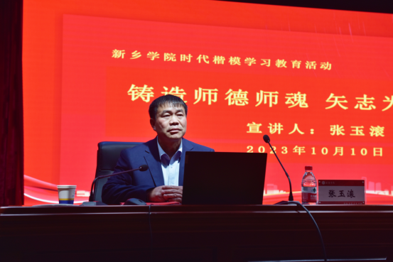 报告会上,张玉滚以《铸造师德师魂矢志为党育人》为题,从做一名挑山工,矢志不移;做一名躬耕者,执着坚守;做一方守望人,快乐前行;做一位筑梦匠,薪火相传等方面,满怀深情地讲述了自己作为一名共产党员、乡村教师,二十年来坚守大山深处乡村学校的从教经历和心路历程。他用自己的行动生动地诠释了育人崇德、师者匠心的深刻内涵。