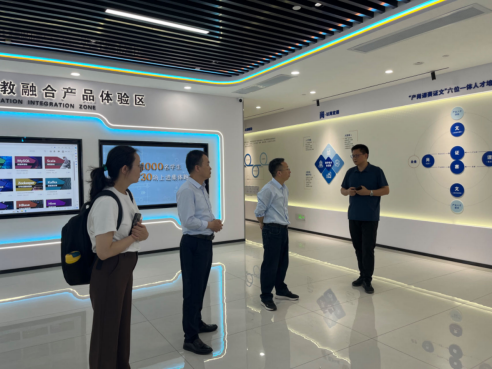 董事长张良均带领参观公司产教融合实训基地,为公司一行介绍泰迪智能科技在大数据领域的技术突破与成就,对泰迪智能科技的发展历程及高校合作解决方案作了全面的介绍与展示。产品体验区中,张良均详细讲述了泰迪智能科技以往开展的项目案例、大数据人工智能平台建设以及泰迪智能科技“大模型”在教学实践应用,校企合作经理吴桂锋对实训实践室产品及沙盘进行演示与讲解。