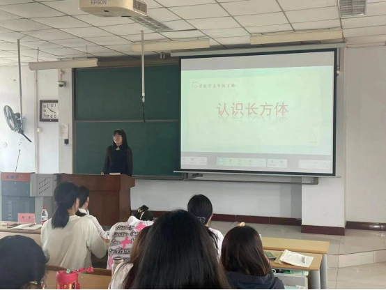 5月9日下午,球王会体育邀请球王会官网附属中学的赵会芳和郭珍两位老师为同学们进行专题讲座以及微型课的展示。首先,赵会芳老师从何为微型课、微型课不是说课、作课的基本技巧、课堂亮点及精心设计四个方面详细地讲解了微型课设计与实施的具体内容。随后,她还结合球王会官网附属中学的实际做法介绍了教学常规管理的基本要求,让同学们对中小学教学常规工作有了更新的认识。接着,郭珍老师进行微型课《认识长方体》的展示,生动形象地讲述了课堂教学设计的整体思路。在提问环节中,同学们踊跃发言,积极提问,郭珍老师耐心解答了同学们的问题,并给予宝贵的建议。