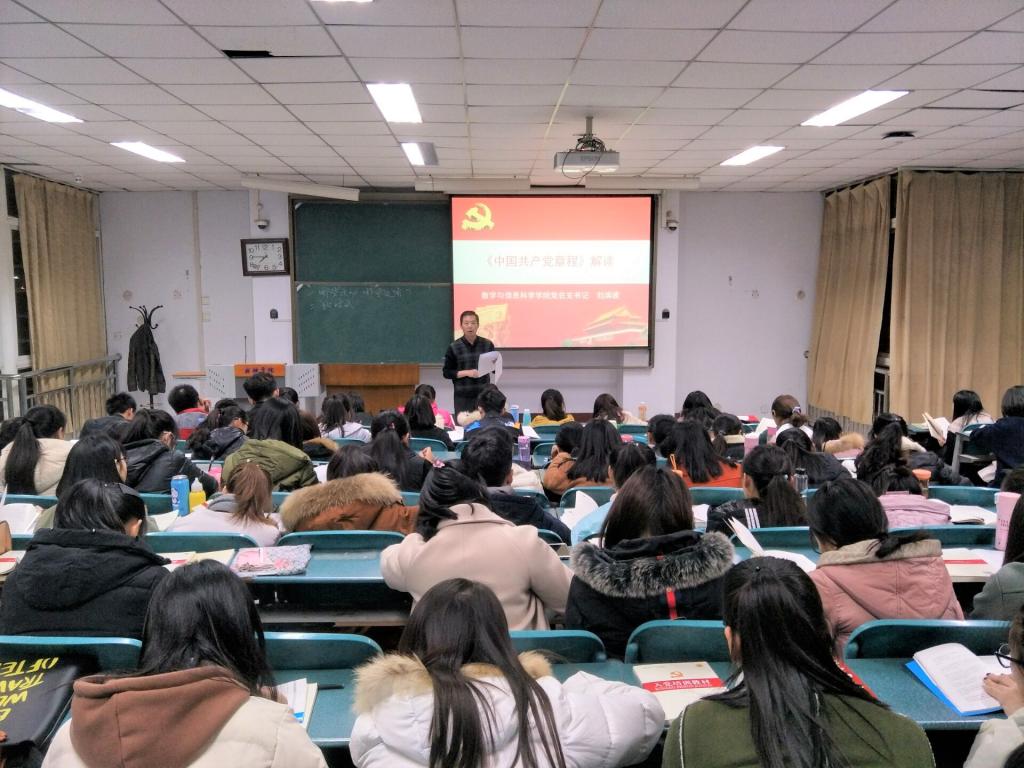 为了使入党积极分子更加坚定理想信仰,数学与信息科学公司党总支书记刘洪波老师于12月4日晚七点在A05-501教室开讲党课培训第一课,主题为解读十九大新修订党章。